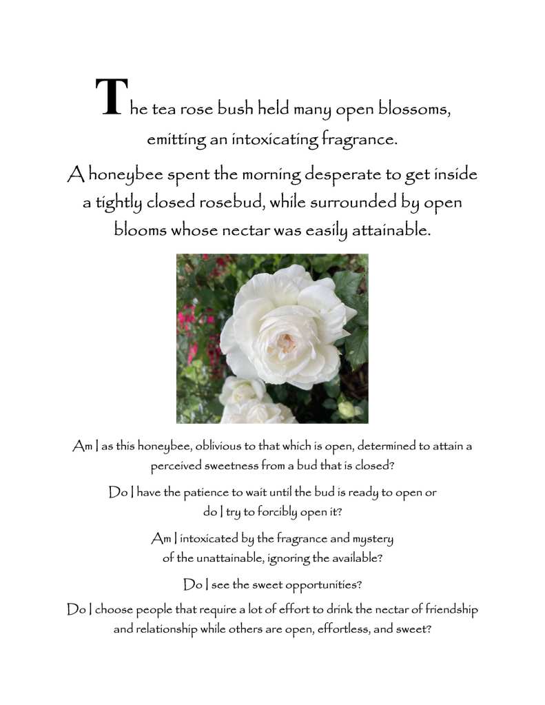I remember the fragrant, colorful, row of roses in my mother’s garden.  My eyes and nose were the same height as the roses, and I was able to see the beauty and breathe in the heirloom intoxicating fragrances.  I often imagined being inside the petals, in the midst of its intoxication, and call that home.